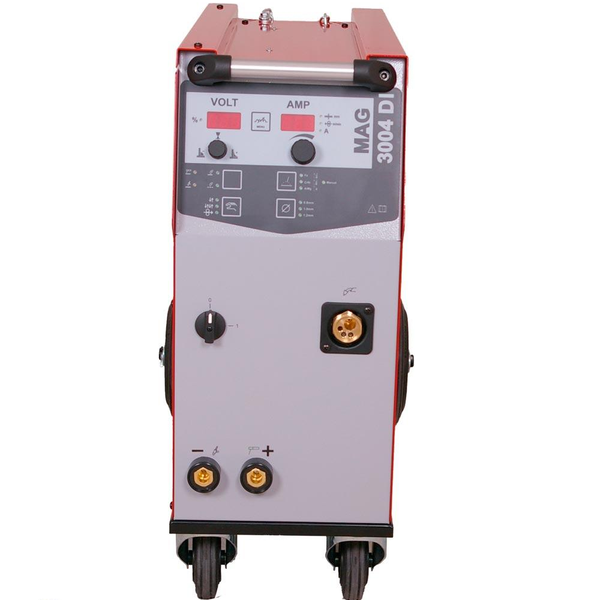 Einfache Handhabung über ein 2-Knopf-Bedienfeld mit Synergic-Funktion für Drahtmenge und Materialstärke, inklusive MMA- und Lift Arc Schweißen. Mit verbreitertem und verstärktem Fahrwerk zur Aufnahme von großen Flaschen und Drahtvorschubmotor mit 4-Rollen Antrieb.